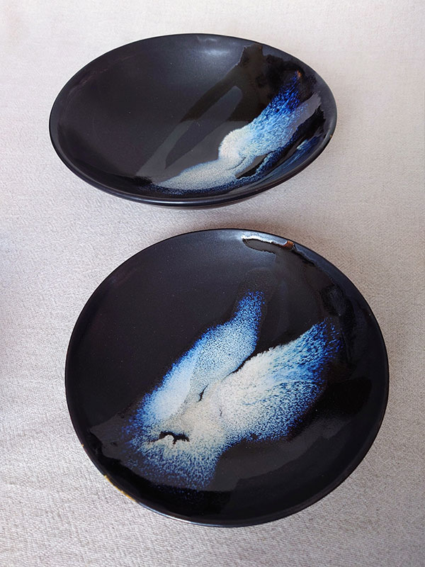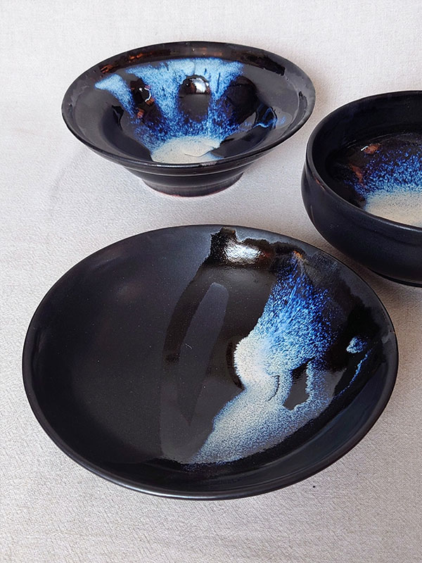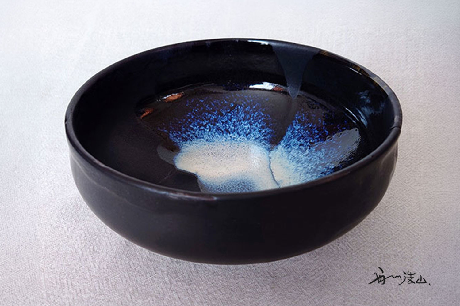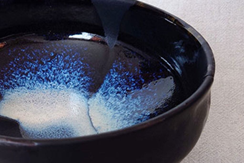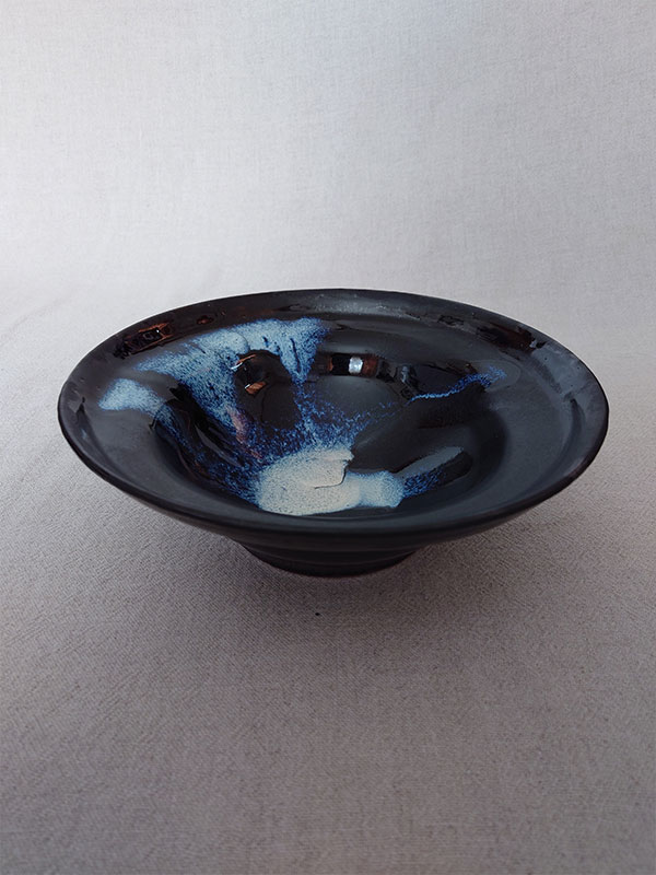 黒釉の艶の違いが、独特な調和をもたらし、合わせた白釉の流文が景色を際立てます。